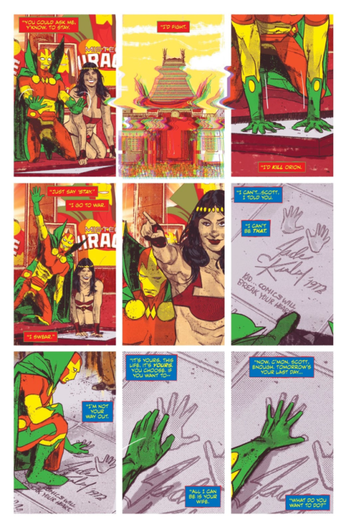 Mais la journée que le lecteur va passer avec Scott Free et Barda fuit tout spectaculaire. Méticuleusement, sobrement, le récit s'écoule en étapes intimistes : certes, la scène d'amour entre les deux amants, agrémentée d'une fantaisie bondage (aboutissant à une pose très christique de Mister Miracle, ce qui permet à Mitch Gerads d'opérer graphiquement la synthèse entre le dieu qu'il est et le simple mortel qu'il reste), détonne mais sinon, ce sont des heures passées en compagnie d'un couple chez qui l'homme s'emploie à faire oublier qu'il s'agit de ses dernières avec sa compagne.
